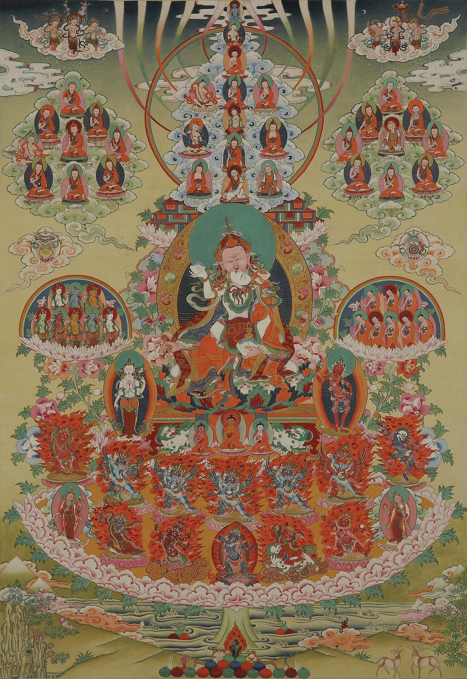 ОсновніЗагальні (I посвята)Практикуються через стадії зарождення та розчинення. Це практики трьох коренів (практика першої тантричної посвяти):Чоловічі1. Зовнішня Гуру Йога2. Рігдзін Дюпа (внутрішня) 3. Дукнал Рангдрол (таємна) 4. Ладруп Тігле Г'ялчен (абсолютна) 4. Палчен Дюпа (синій, несамовитий) 5. Такюнг Барва (червоний, шалений) Жіночі1. Юмка Дечен (блаженна)2. Сенгє Дончен (несамовита левиця) Залальні (II посвята)Практика каналів та вітрів (практика другої посвяти).Загальні (III посвята)Махамудра (практика третьої посвяти).Особливі (четверта посвята)Для лінивих — медитація прориву трекчо основана на світогладі примордиальної чистоти кадаг. Для старанних — медитація прямого перетворення тогал основана на світогляді спонтанної присутності лхундруб.1. Еше Лама 2. Цоклі Лонгчен Нінгтік 3. Мандали Садхан | |||||